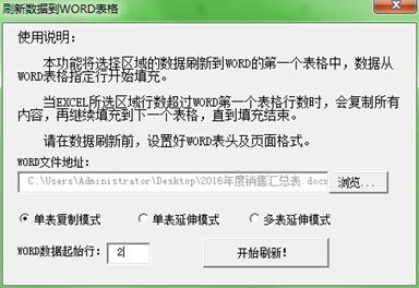 选中EXCEL中要填充到WORD表格中的单元格区域,点击 “刷新WORD表格()”按钮,如下图:点击浏览找到要注入数据的WORD文件,选择“单表复制模式”,WORD文件中表格是从第二行开始注入数据,所以在“WORD数据起始行:”处填入“2”,点击“开始刷新!”