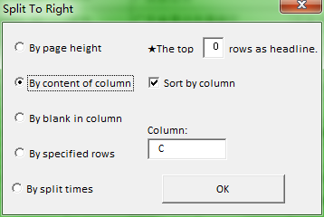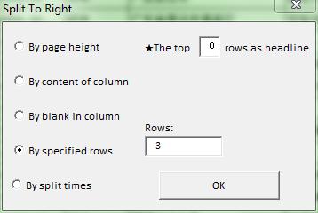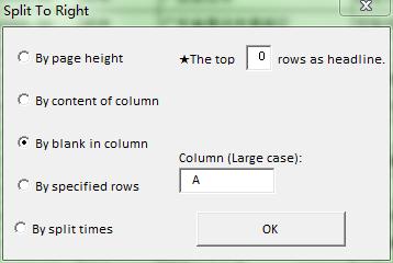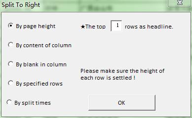 ¡ï"Split To Right" has three modes. Except "by times" there has other two modes, One is "By rows",Splits area selected to sections according of specified rows and move to the right separately. For instance, you can estimate how many rows in one page, then split by this number. Two is "By column", Splits area selected to sections according of column entered and move to the right separately. You can think about if order the data by specified column, For instance, apply to print by department etc.