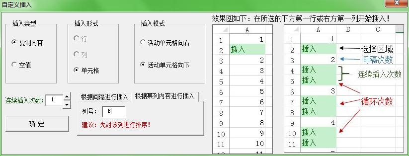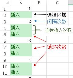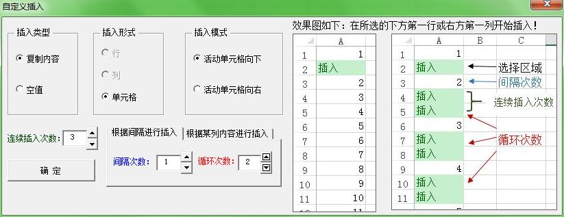 自定义插入功能比较强大,通过对各个参数的选择,能够多种插入、复制效果。下图就“循环次数”、“间隔行数”及“连续插入次数”的概念进行说明。