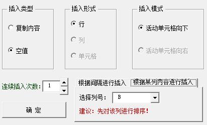 选定第1行,点击铵钮“自定义插入()”,在插入类型中选择“空行”,选择根据某列内容进行插入,并在列号处输入要进行判断的列号“B”。确定即可。如下图:
